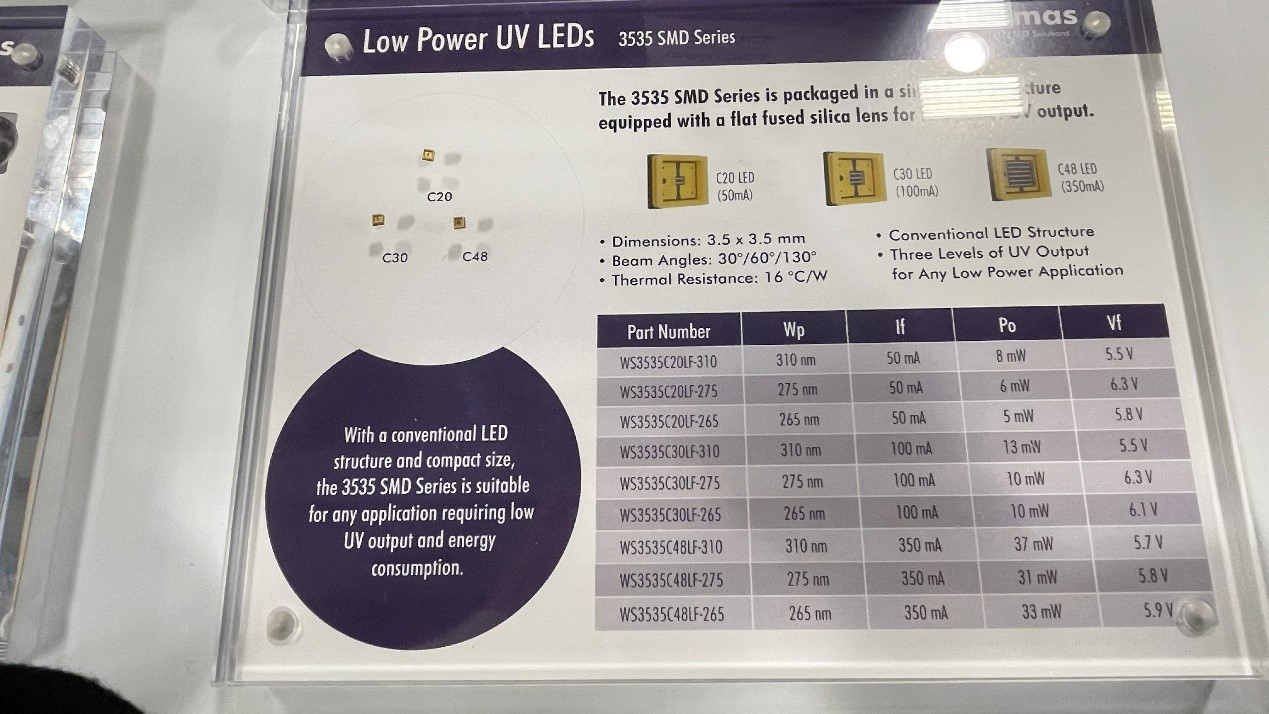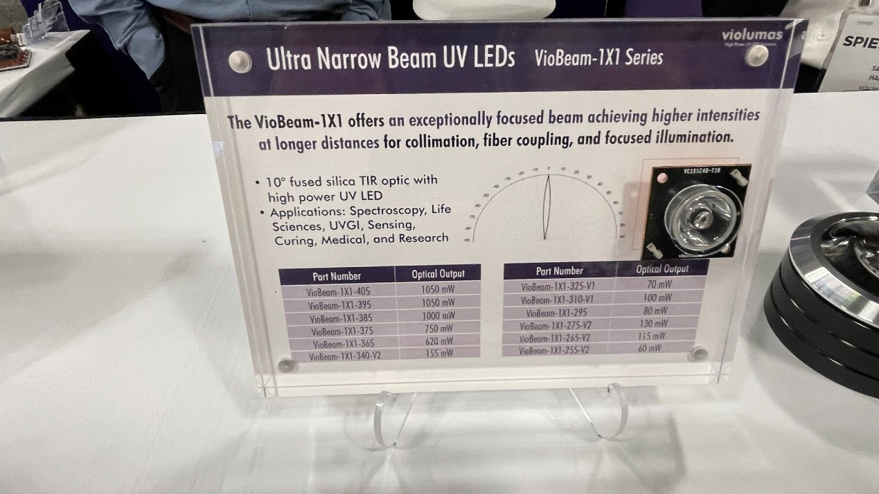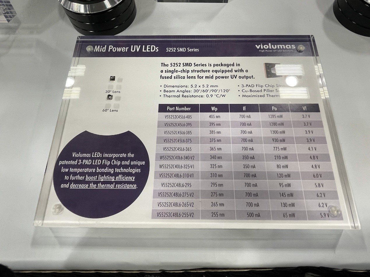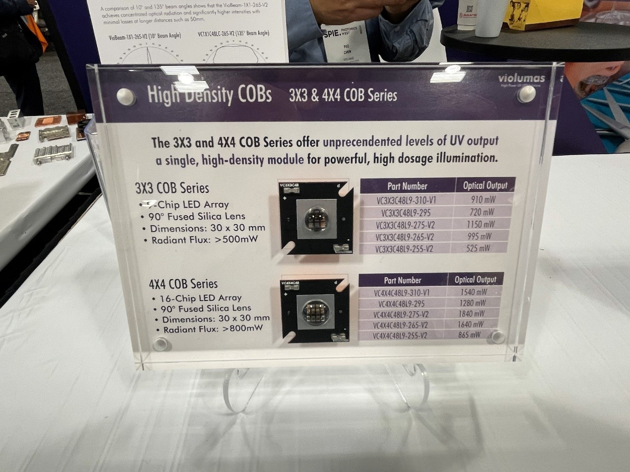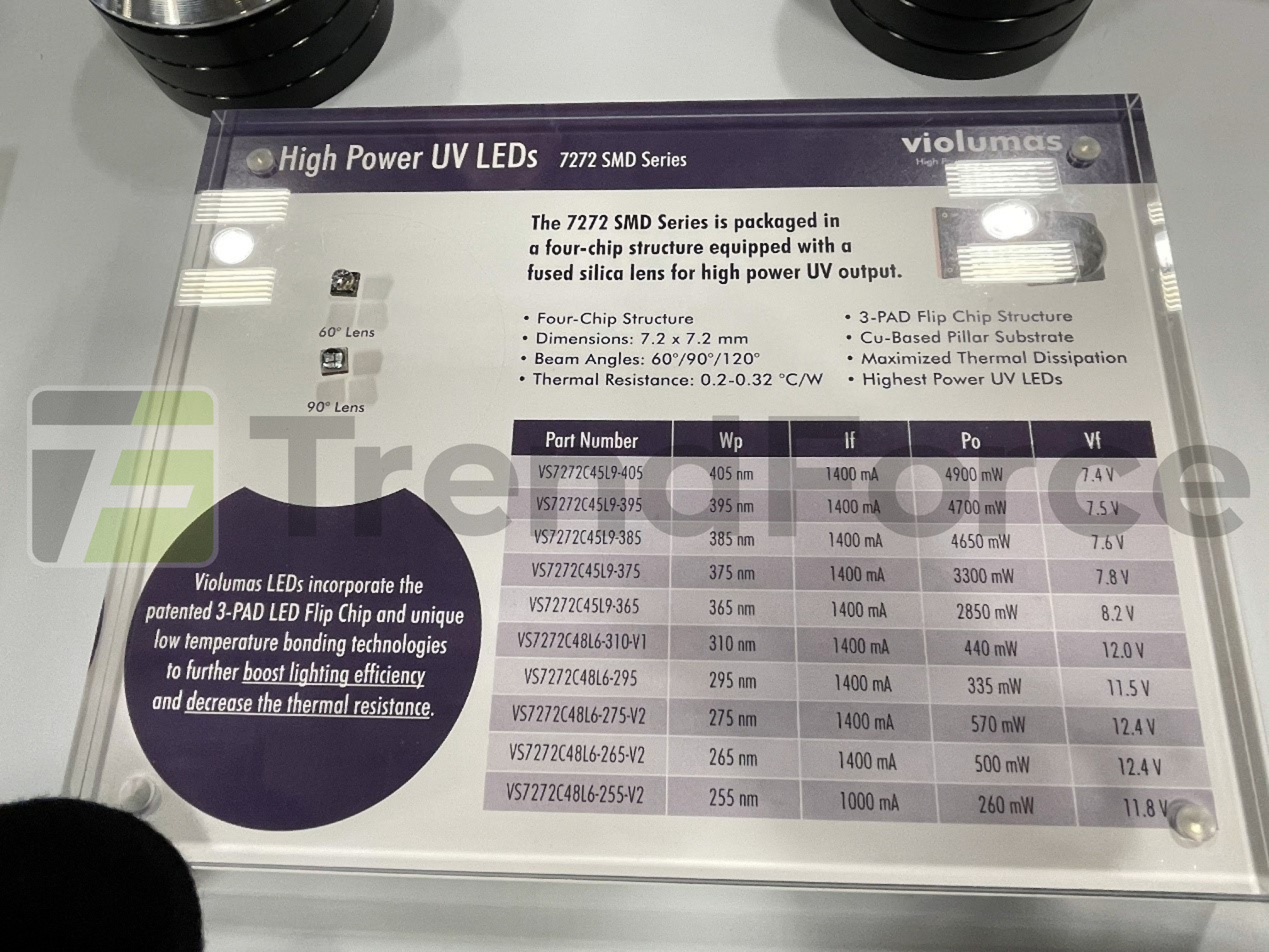 Violumas也開發了7272 UV LED (四晶封裝),支援60°、90°和120°的發光角度,以及3×3或4×4 COB LED封裝。另有具備10°超小發光角度的高功率UV LED提供UV-A、UV-B和UV-C波長產品,為準直光學、聚光照明及光纖耦合應用提供所需動能。