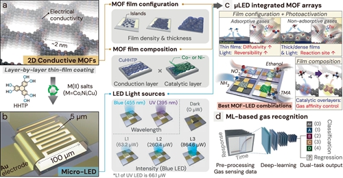 近日,韓國科學技術院(KAIST)攜手高麗大學、韓國基礎科學研究院及中央大學的研究團隊宣布,開發出一種新型光激活化學電阻式氣體傳感技術,將導電型金屬有機框架材料(conductive Metal–Organic Framework(cMOF))與Micro LED結合,成功實現了在室溫下進行高靈敏度、低功耗的氣體檢測。