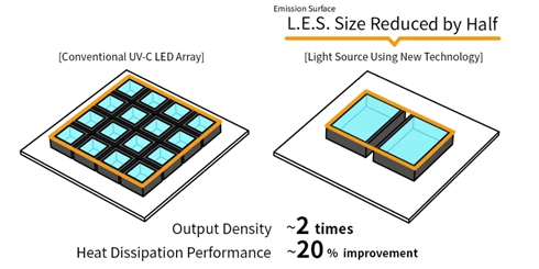 借助這一新型UV-LED光源技術,日本企業三浦工業成功開發出全新的無汞UV-LED水殺菌設備,其處理能力在保持原有光源尺寸的前提下,從每小時10立方米提升至25立方米,性能提升2.5倍。