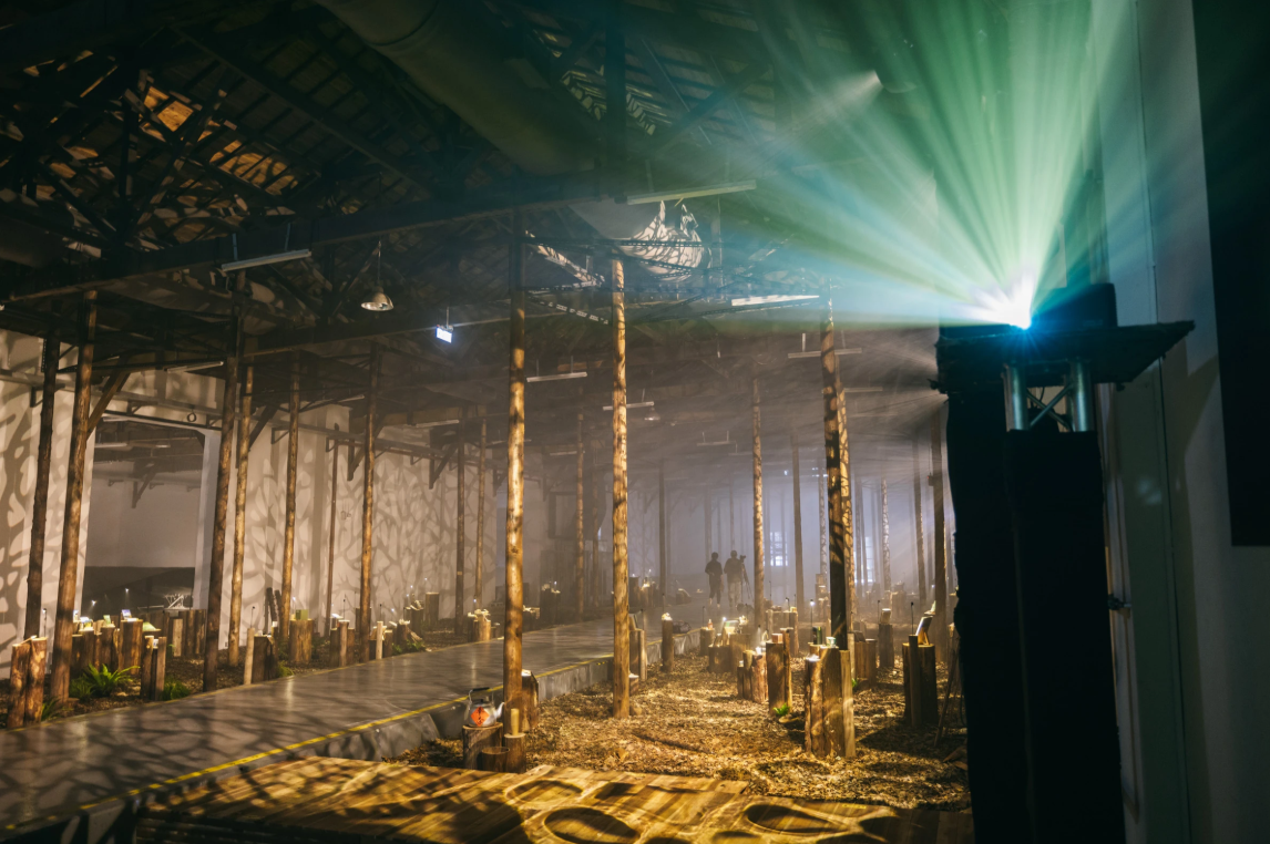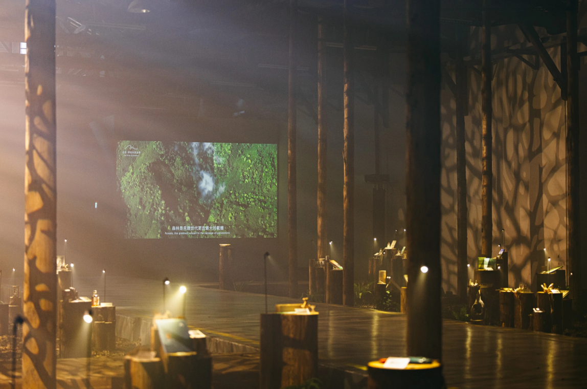 位於松山文創園區《文化策展區》的「穿霧之境」、「有河之靈」、「接海之島」、「臺灣萬水」四大主題展區,詮釋從山海地貌延伸至多元文化的韌性與活力。「穿霧之境」以枯葉鋪地與層層霧氣,引領觀眾穿越臺灣淺山與深林。展區採用 ViewSonic 8,500流明高亮度雷射投影機,其卓越亮度與廣色域還原技術,即使在多盞投射燈照明與霧氣交織的環境中,依然清晰展現山林層次與細節,營造步入靜謐霧林的沉浸體驗。投影畫面在群山與湖泊之間流暢切換,巧妙地擴展空間深度,讓觀展者彷彿登上高山休憩或佇足湖畔奉茶。