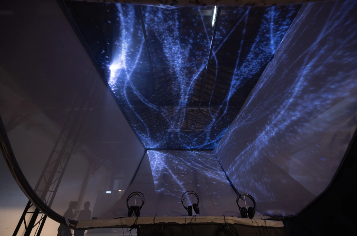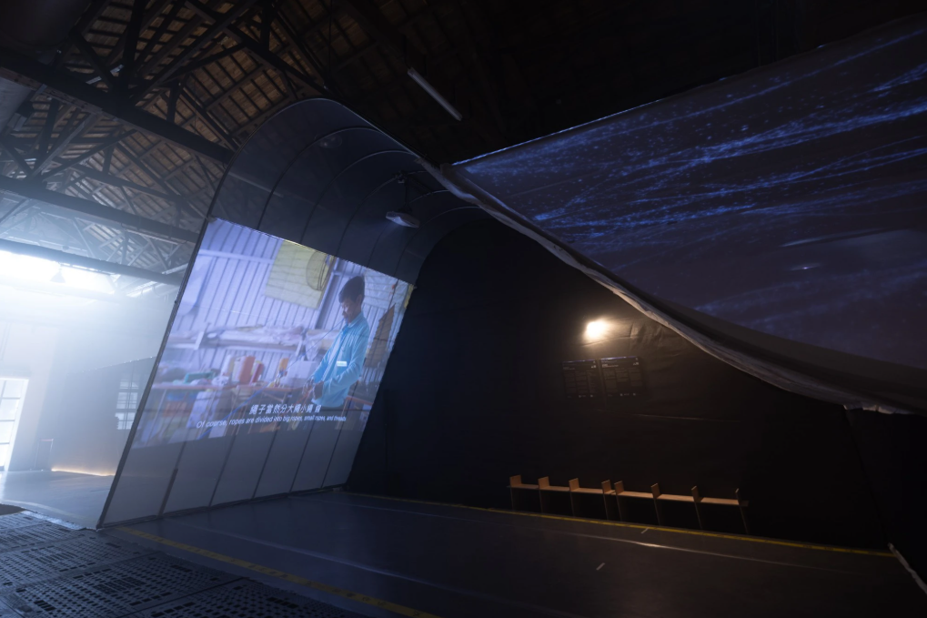 「有河之靈」展區將人們對於水的記憶與信仰,融入以網紗構築的臺灣地景。ViewSonic超短焦雷射投影機憑藉其高對比度與Cinema SuperColor™色彩技術,有效克服展區環境光帶來的亮度與色彩挑戰,觀展者得以近距離在透光的網紗上觀賞水祭儀式及王船製作細節,感受傳統信仰的深度與文化脈動。展區另一處則透過投影效果營造「靈魂伴水而生」的意象,即便在有限的側面安裝空間,設備仍能精準投射出河水流動的波紋效果,搭配 GeoBox 互動壓縮技術,創造傳統媒材難以達成的沉浸互動體驗。
