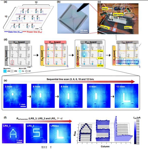 更重要的是,GT-MEMT的制程無需熱退火工藝,相比傳統的TFT系統大幅簡化了陣列集成流程。Tae-Geun Kim研究團隊基於這一架構,成功制備出12×12無電容AM Micro LED陣列,能夠穩定顯示字母字符,驗證了其在高分辨率顯示中的可行性。