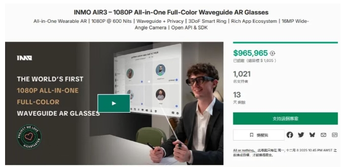 近日,國產AR廠商影目科技(INMO)在海外市場傳來捷報,其最新產品INMO AIR3在海外眾籌平台Kickstarter上亮相,截至11月25日上午12點,該項目已募集資金約96.6萬美元,吸引了1021名支持者。