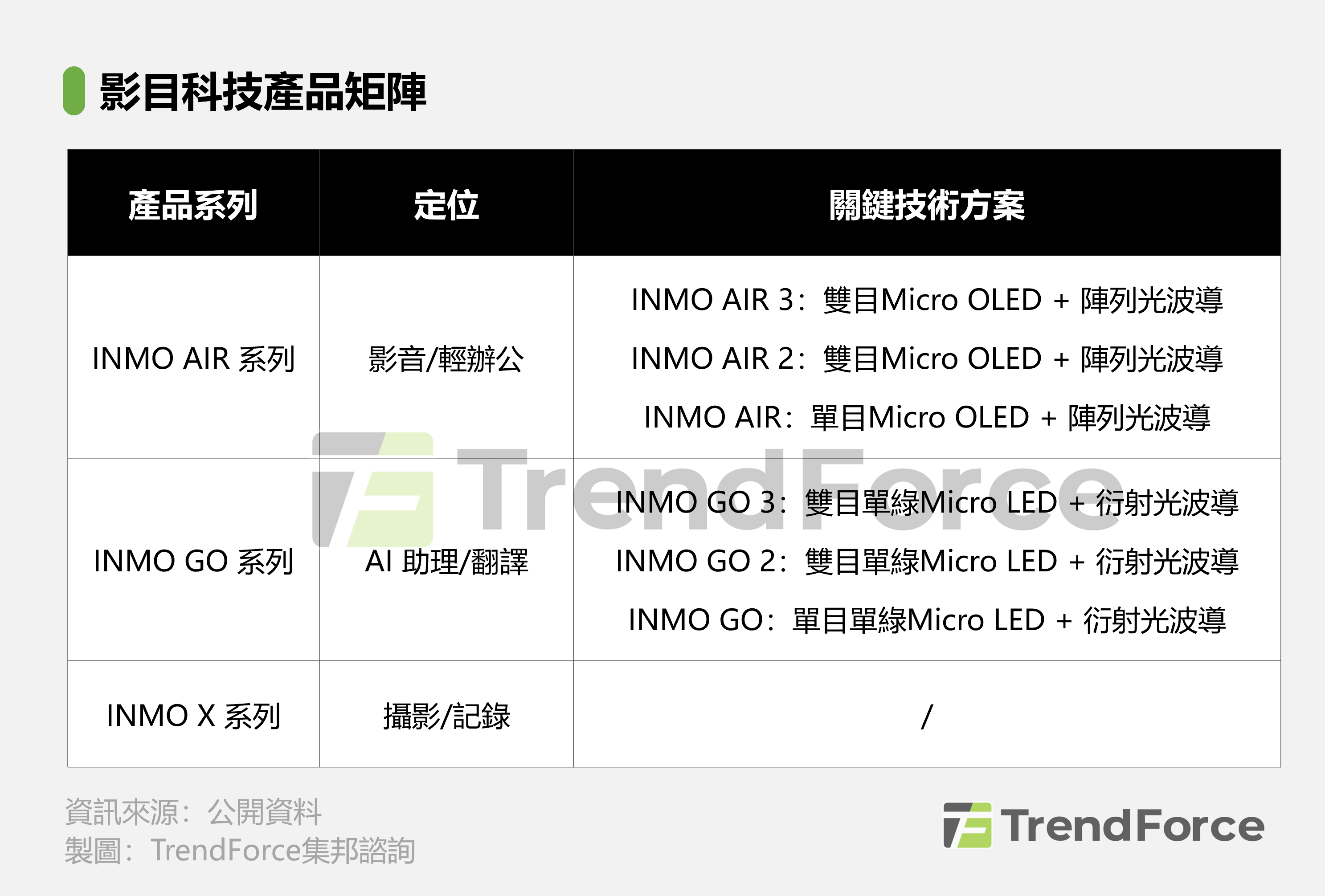 目前,影目科技已經形成了三大產品線布局:包括主打輕辦公與影音娛樂的INMO AIR系列、專注於翻譯場景的INMO GO系列,以及針對拍照場景的INMOX系列。縱觀其產品布局,可以看出其在顯示技術路線上采取了差異化的策略,以適應不同產品線的定位。