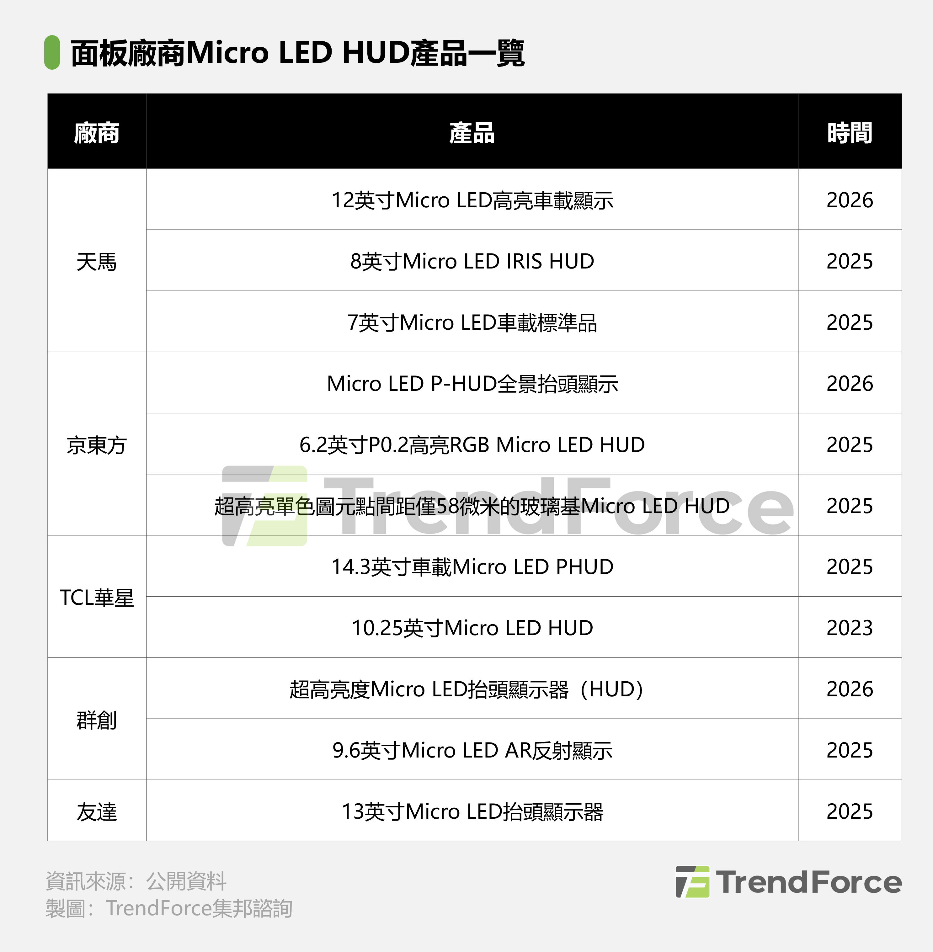 值得注意的是,過去的2025年,天馬、TCL華星、京東方、友達與群創等面板廠商陸續推出了各自的產品和技術方案,進一步推動了Micro LED在HUD車載顯示領域的應用。