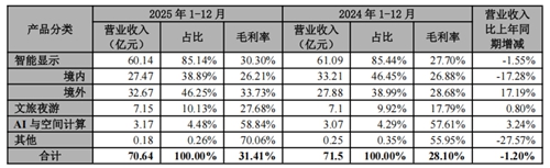 智能顯示板塊全年實現營收60.14億元,占總營收的85.14%,雖然同比微減1.55%,但毛利率從上年的27.70%回升至30.30%,重新站上30%水平線。