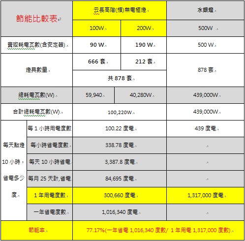 表(二)云長高階無電極燈取代水銀燈節能率