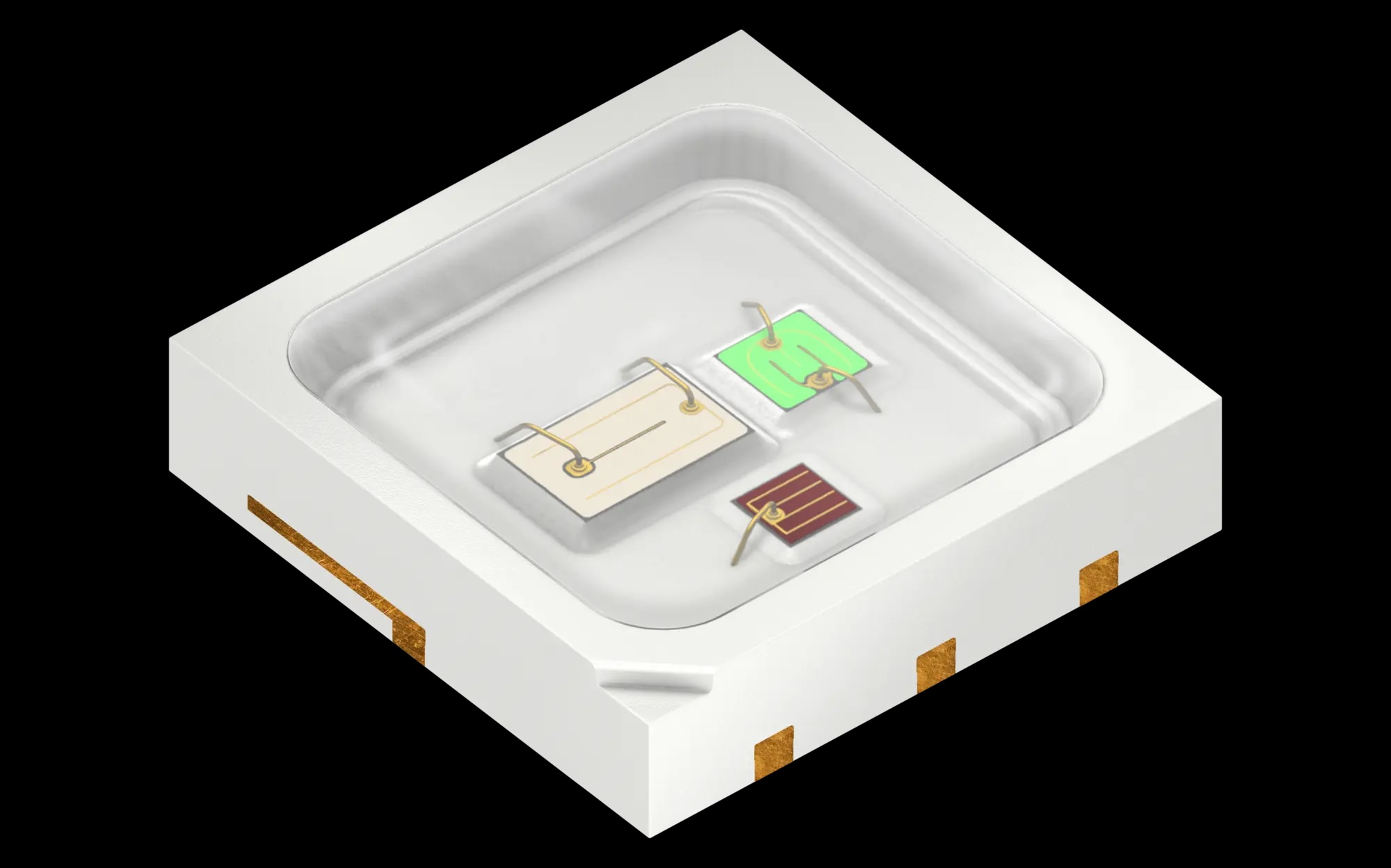透過精密分檔技術(binning),OSIRE™ E3030 穩定運行於 0.5 W 功率範圍。根據色點設定,在 200 mA 電流下,紅光與藍光的典型光通量分別可達 22.4 至 40 流明與 7.1 至 14 流明;綠光則在 150 mA 下達 28 至 50 流明。寬廣的波長範圍可呈現更豐富的色域,讓設計師能靈活調配最契合車艙氛圍的光色。三個獨立可控的色彩通道提供高度的混色自由度,而三角排列的LED 晶片設計則確保卓越的角度色彩一致性,特別適合圓形導光條的光學設計需求。