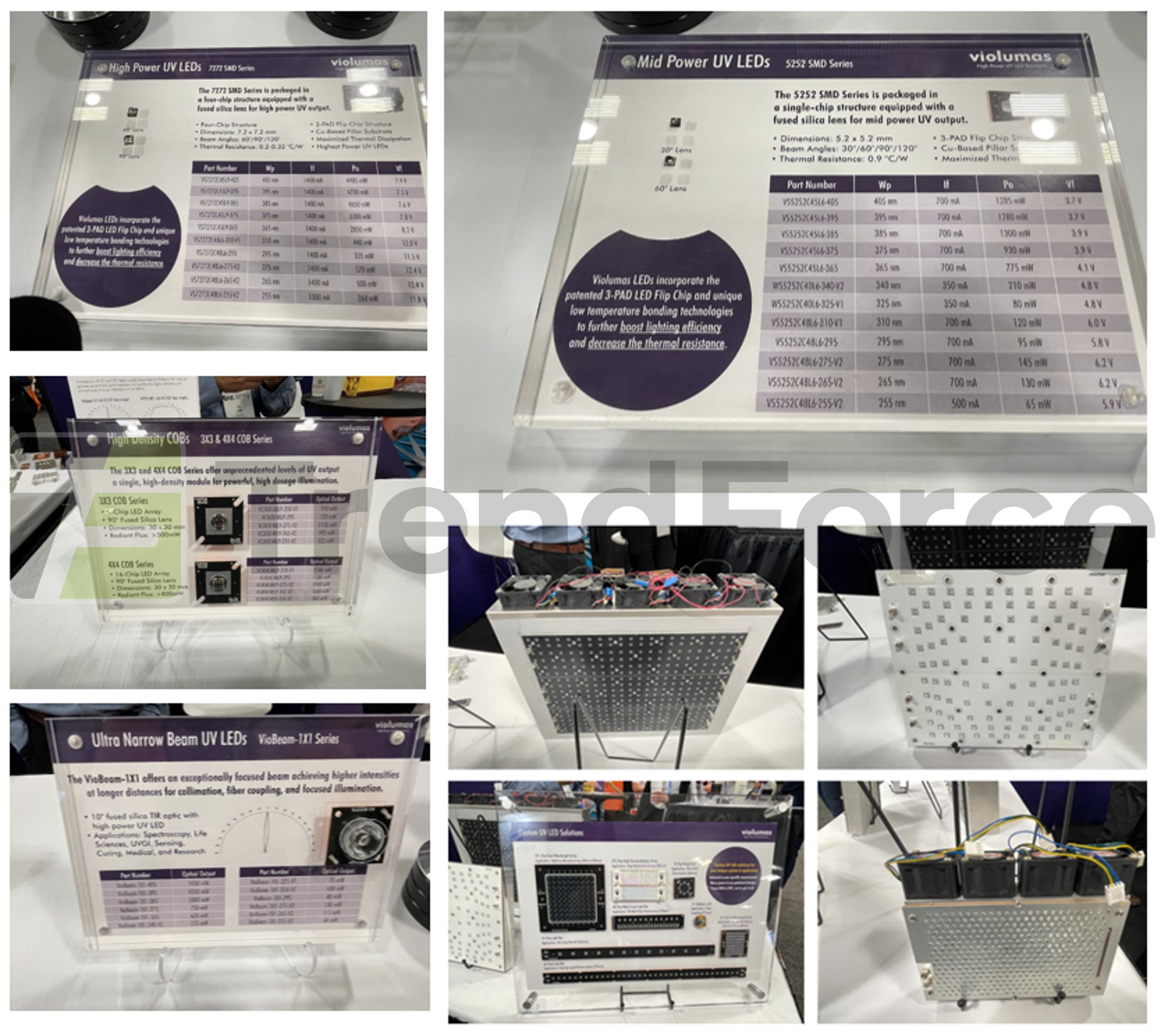 255-275nm 的 5252 UV LED,光學功率達到 65-145mW,再次立下 UV-C LED 市場的重大里程碑。此外,因應醫療市場需求,Violumas 推出的 340nm 210mW UV-A LED 在 2026 年持續備受市場關注。Violumas也開發了 7272 UV LED (四晶封裝),支援 60°、90°和 120° 的發光角度,以及 3×3 或 4×4 COB LED 封裝。另有具備 10° 超小發光角度的高功率 UV LED 提供 UV-A、UV-B 和 UV-C 波長產品,為準直光學、聚光照明及光纖耦合應用提供所需動能。