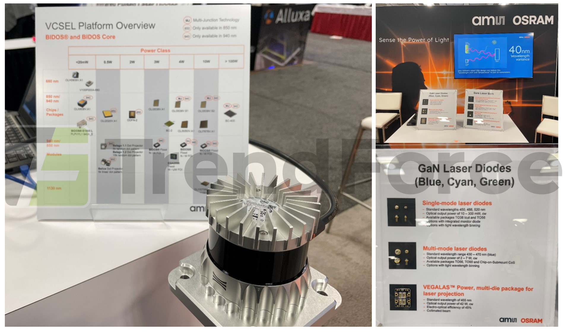 光達: 艾邁斯歐司朗 (ams OSRAM) 成功推出八通道光達雷射產品- SPL S8L91A_3 A01,以全新晶片設計提升輸出功率 (Output Power) 達 1,000W (320A, 10.8V),產品效率達 30%。除封裝產品外,雷射晶片也可製成 Laser Bar 提供給光達模組廠商,更為彈性設計使用。除此之外, ≥100W VCSEL 產品已成功導入光達廠商如 Ouster。