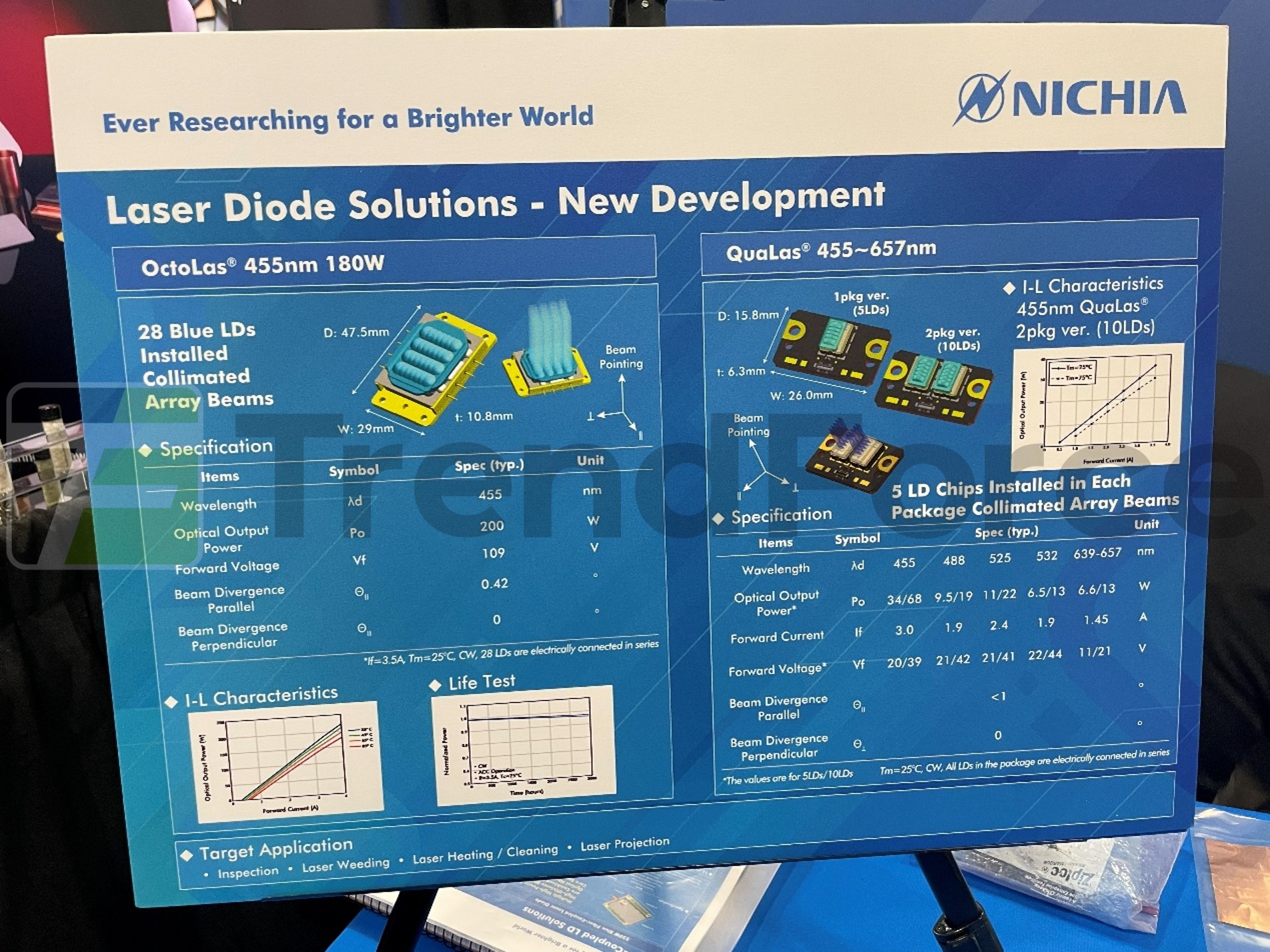 Nichia 以全系列自有生產 RGB 雷射晶片、封裝與模組。OctoLas 應用於 ≥ANSI 10,000 lm 電影院投影機市場;QuaLas 應用於 ≤ANSI 10,000 lm 以下商業/居家的投影機市場。