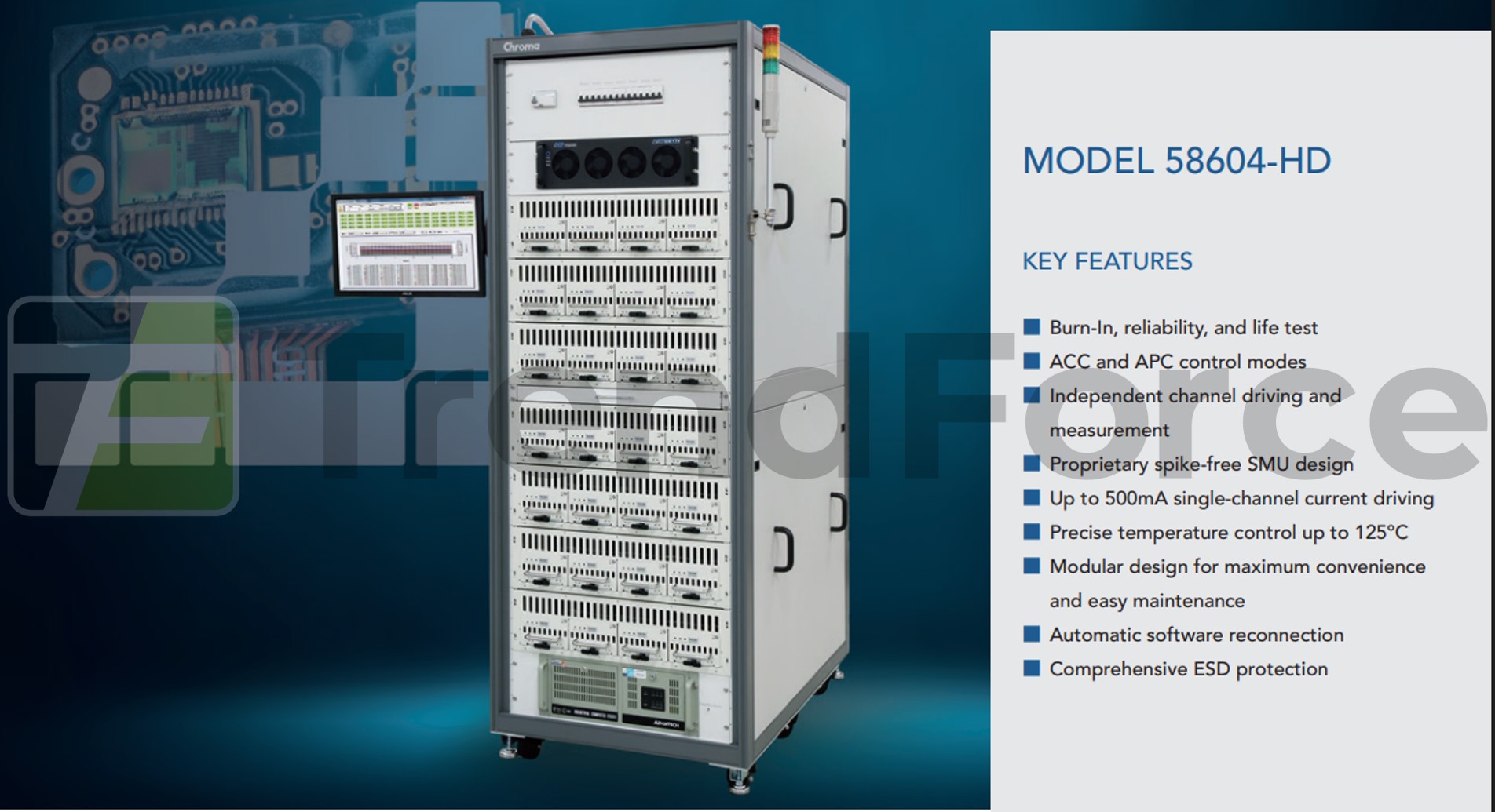 光通訊市場對於雷射可靠性要求相當嚴苛。雲端服務供應商 (Cloud Service Provider;CSP) 要求雷射光源產品需通過 24-48 小時燒測 (Burn-in) 與 100%挑揀。致茂推出 Model 58604-HD 以滿足光通訊與矽光子 CPO 市場要求。