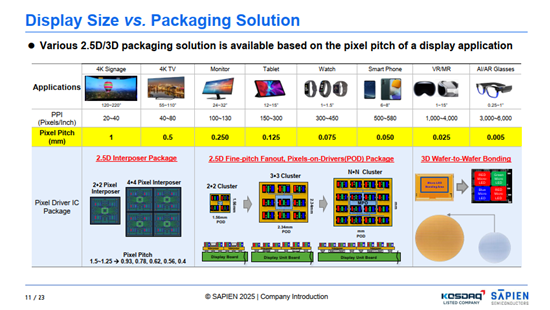 李明熙表示,SAPIEN Semiconductors已成功提供標準化與客製化的 CMOS 產品,以滿足不同客戶的需求。例如,該公司目前已向市場提供採用 28nm 節點的標準全彩 CMOS產品,以及採用 22nm/28nm 節點的客製化單色 CMOS 背板 IC,支援 2.5µm 的像素間距,解析度達 800×600 至最高 2K。未來,公司規劃突破22nm製程節點與2µm像素間距的技術門檻,以實現1280x720 或更高的 FHD解析度。針對大型顯示器,SAPIEN Semiconductors正致力開發Micro IC,為美國主要科技公司提供具附加價值的解決方案,產品主要鎖定新一代筆電顯示器應用。這些解決方案旨在提升亮度均勻性、提高對比度並降低功耗,從而實現更卓越的靜態與動態畫質。