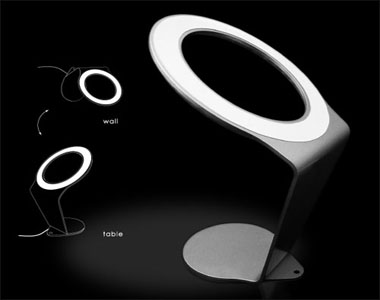 這款LED檯燈底長12cm、寬15cm、高22cm,可根據需要選擇壁掛或者放在桌面上。它的構造非常簡單,鋁製底座及「腰身」自然過渡,而且厚度僅僅為3mm。LED燈均勻分佈在360度的圓環內,既美觀,又能有效地利用光源防止倒影。另外,電源線從鋁製金屬板中穿過,也避免了電源線對整台LED燈美觀的干擾。從整體上看,這就像一張摺紙,簡單隨意,但是非常實用。