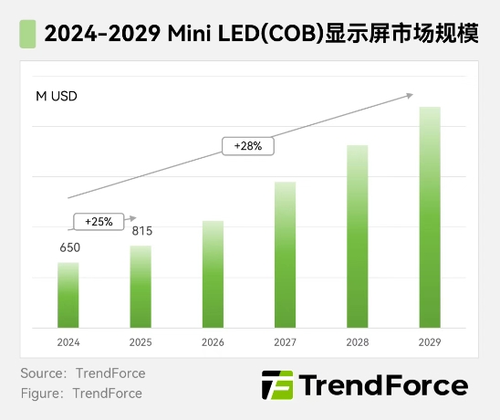 與P1.0的短期承壓形成對比的是,COB技術正迎來高速滲透期。TrendForce集邦咨詢預計,今年全球COB產值將達到8.15億美金,同比增長25%。