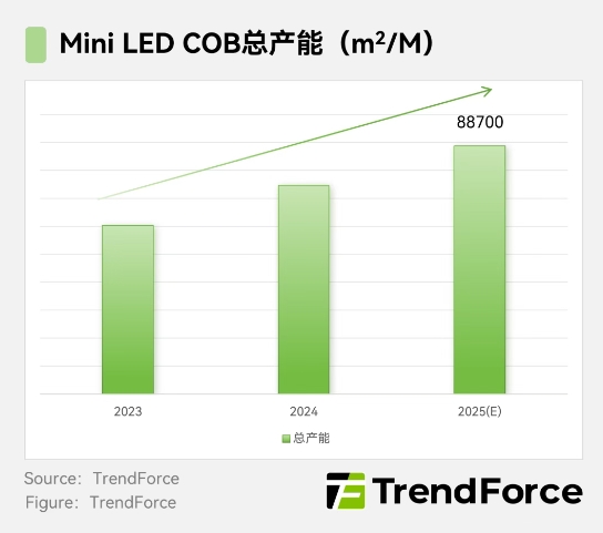 COB的快速成長跟行業的投資密不可分。根據TrendForce集邦咨詢統計,COB產能在2024年約為6萬㎡/M,預計今年將達8.87萬㎡/M,新增產能約2-3萬㎡/M。在這超過2萬㎡/M的新增產能中,很大部分來自LCD面板廠商的投資。