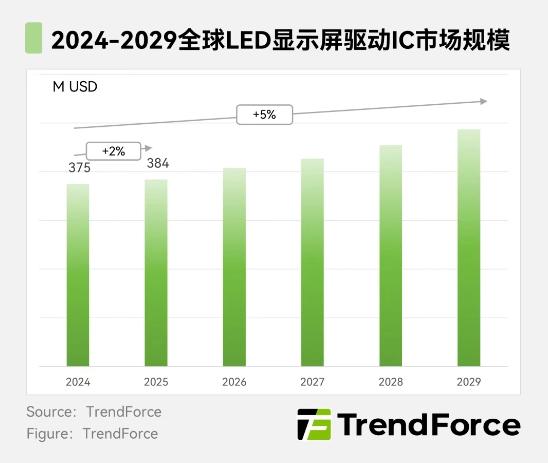 在配套的驅動IC方面,該領域廠商眾多。雖然集中度高,但不同於控制系統,顯示屏驅動IC領域仍不斷有新廠商進入。TrendForce集邦咨詢預估,今年全球LED顯示屏驅動IC市場規模預增2%,前五大廠商市占率超8成。