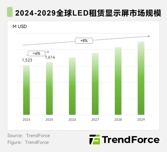 租賃市場的未來增長邏輯保持不變,演唱會等活動使用的屏幕數量持續增加。盡管近年受經濟環境變化影響,市場表現有所放緩,更換周期亦有所延長,租賃屏也正朝間距微縮化發展。TrendForce集邦咨詢預計2025年全球LED租賃顯示屏市場規模將達到16.14億美金。