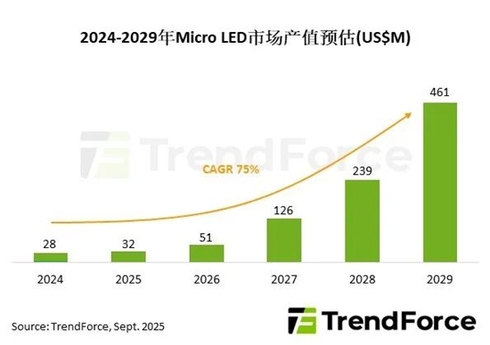 總的來說,Micro LED技術正加速從實驗室走向產業化,全球範圍內的研發合作與投資布局日益深化。據TrendForce集邦咨詢分析,盡管2025年整體LED市場受宏觀環境影響增速放緩,但Micro/Mini LED等細分領域仍保持增長動力,非顯示與透明/汽車等利基市場將成為重要驅動力,預估2029年Micro LED芯片市場產值將提升至4.61億美金。(文:LEDinside Janice)