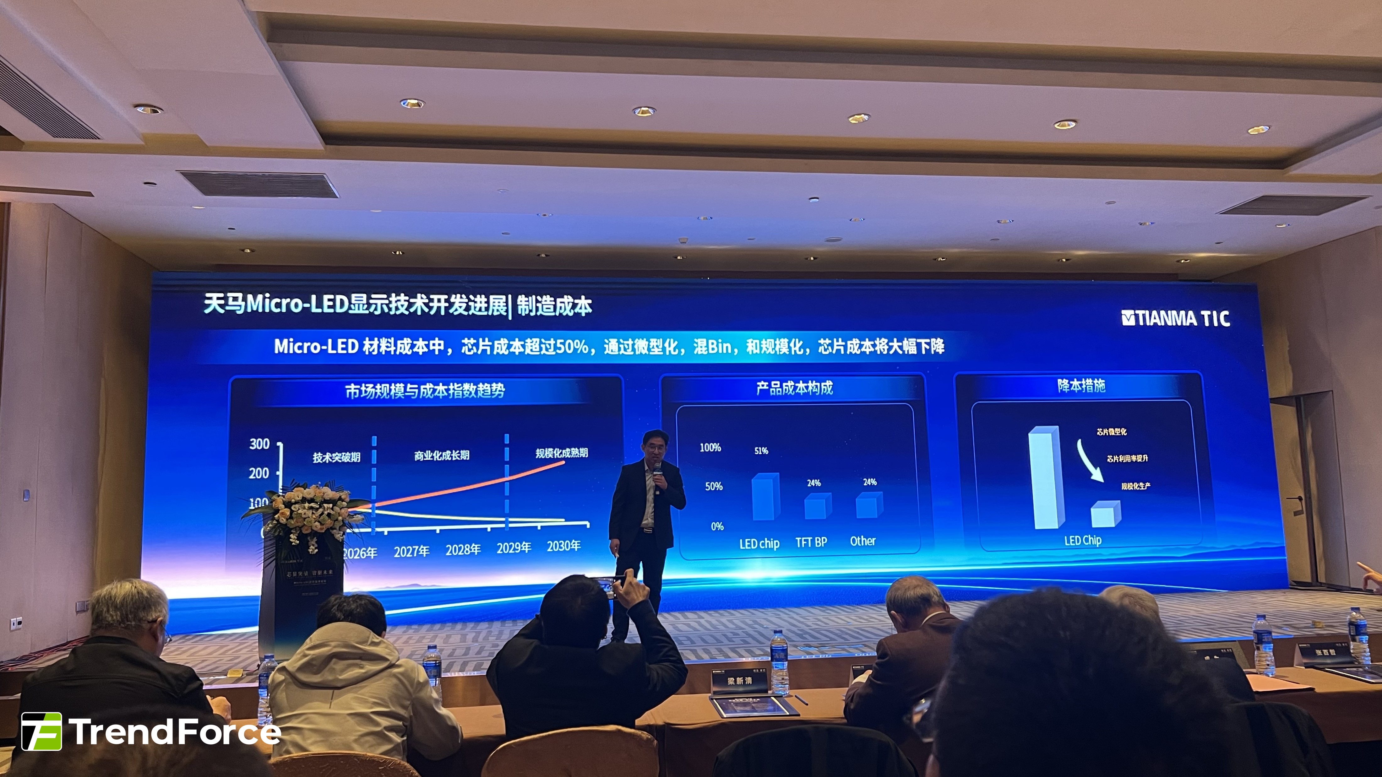 天馬Micro-LED產線負責人周波則表示,作為面板廠商,天馬也在針對Micro-LED芯片微縮化所產生的亮度和波長均一性問題,開發了混BIN技術+De-mura算法補償技術,將芯片均一性提升至90%以上,從而降低芯片成本。