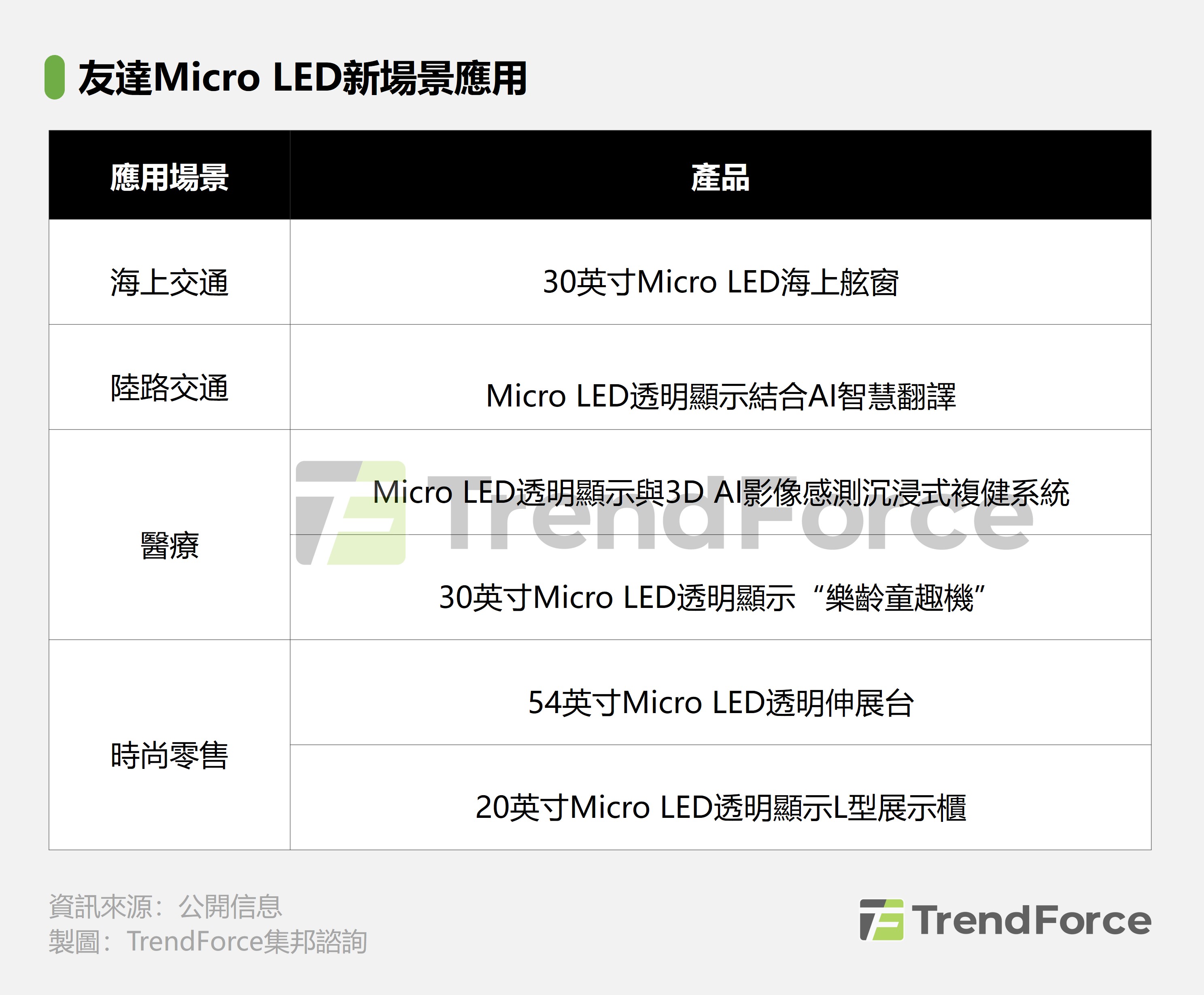 除了交通領域,在此前的布局中,友達還將Micro LED技術延伸至醫療和零售領域。