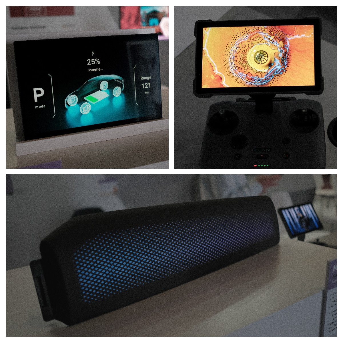 圖8. 左: 無人機控台 (夥伴: 義隆電子和鴻利顯示);中間: 車用中控屏 (夥伴: 海微科技); 右: 氛圍燈 (夥伴: 東莞精旺電子)