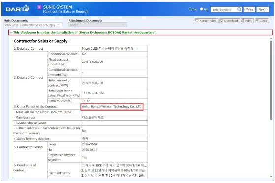 2月5日,據韓國媒體報道,半導體及顯示設備專業企業Sunic System宣布,已與中國企業安徽宏禧微顯科技有限公司(Anhui Hongxi Weixian Technology Co., LTD.)簽署了價值約205.76億韓元(約合人民幣9778.6萬元)的OLEDoS顯示屏量產用蒸鍍設備供應合同。