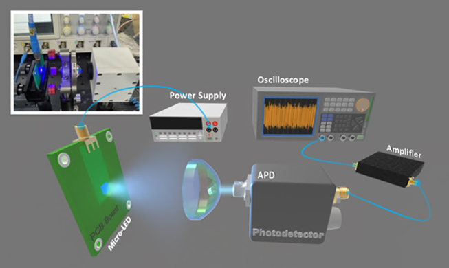 QRNG實驗架構示意圖,包含作為量子熵源的Micro-LED、聚焦透鏡及雪崩光電二極體。