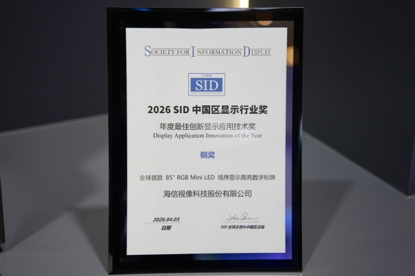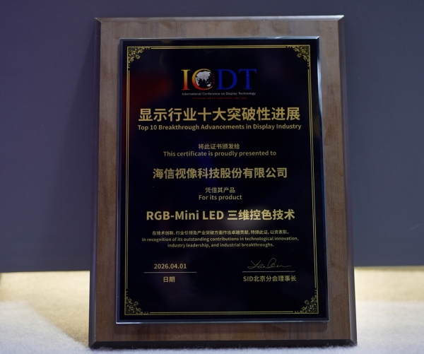 近日,2026年國際顯示技術大會(ICDT)在重慶舉辦。海信憑借顯示領域的突破性創新,一舉斬獲三項重磅大獎,包括全球首創的RGB-Mini LED技術入選“中國顯示行業十大突破性進展”獎,成為近十年唯一獲得重大突破獎的大屏液晶顯示技術,全球首款玲瓏4芯真彩背光RGB-Mini LED電視116UX榮膺“年度最佳顯示應用產品金獎”,全球首款85吋RGB-Mini LED場序顯示高亮數字標牌斬獲“年度最佳創新顯示應用技術獎”。