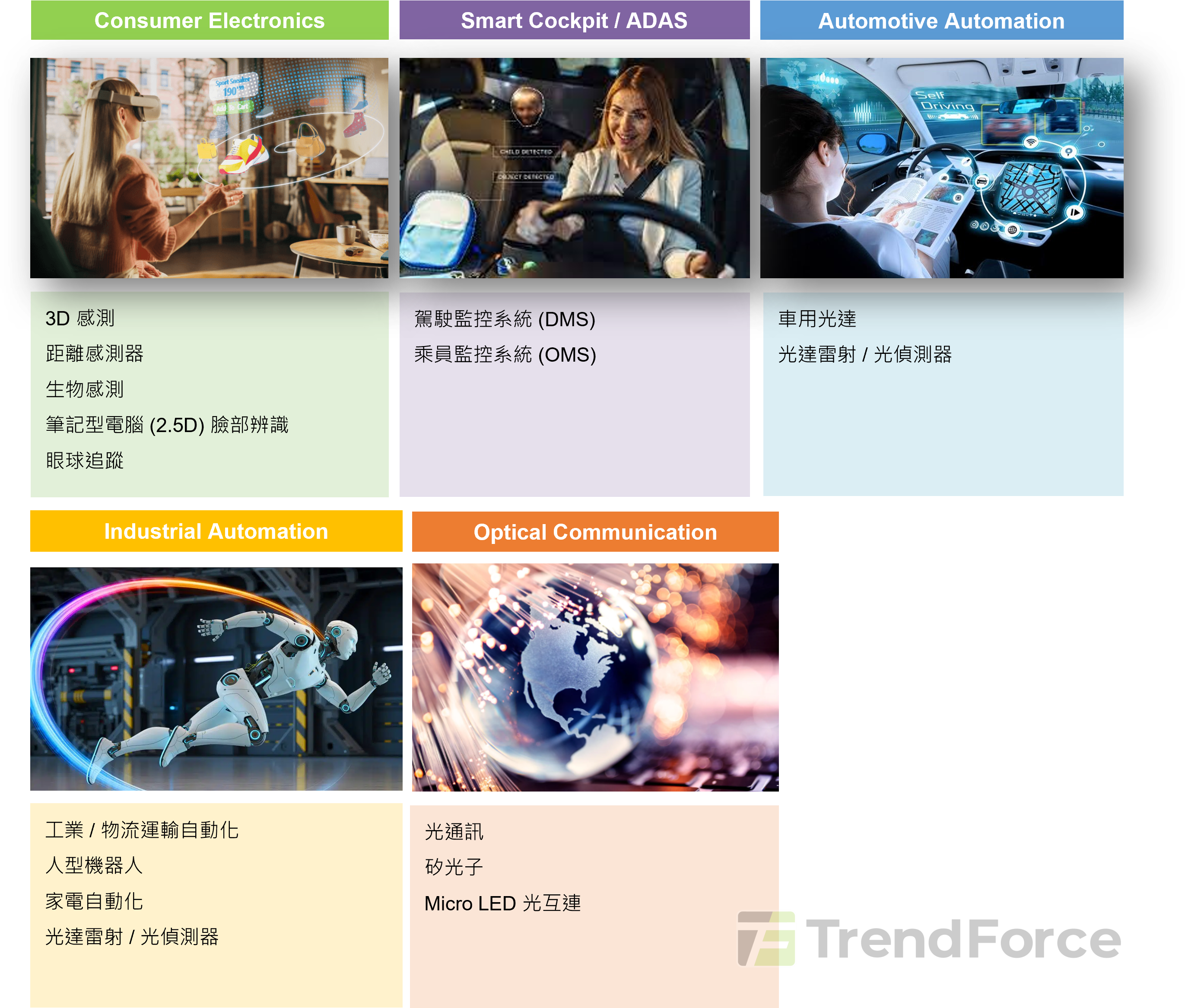 TrendForce 2026 紅外線感測應用市場與品牌策略聚焦於五大高成長性應用市場,包含 1) 消費性電子產品、2) 智慧座艙 / 先進駕駛輔助系統- 駕駛/乘員監控系統、3) 車用自動化- 自動駕駛、4) 工業自動化與人型機器人、5) 光通訊市場的產品趨勢、供應鏈與紅外線產品 (EML、CW LD、InGaAs Photodiodes) / Micro LED 光互連模組價格調查。