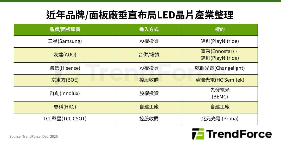 TCL CSOT(TCL華星)近日成功競得兆元光電80%股權和相關債權,TrendForce表示,此次收購標誌著TCL CSOT正式進入LED晶片領域,完成從上游晶片到下游Mini LED顯示應用的供應鏈布局。自2018年以來,Samsung、AUO、Hisense、BOE、Innolux和HKC等多家品牌、面板廠已陸續推動類似併購或投資案,深化產業垂直整合趨勢。